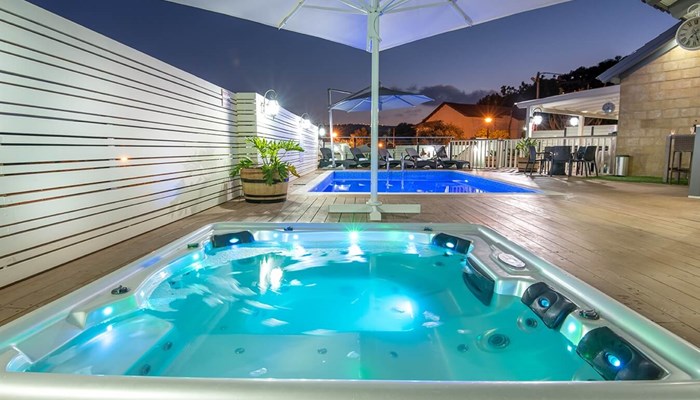מתחם חצר מושקע ומטופח, במרכזו בריכה צוננת תחת כיפת השמיים, המקורה ומחוממת בחורף.
