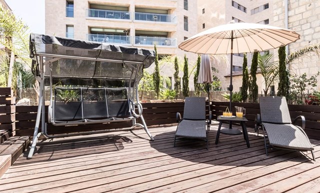 מחוץ לסוויטות מחכות לכם חצר מטופחת ומרפסות פטיו גדולות המשקיפות אל נופי העיר. תוכלו להתרווח בפינות הישיבה, להתנדנד על הערסלים ולתת לגוף ולנפש שלכם להיטען מחדש, בשקט ובשלווה של ירושלים. לרשותכם גם עמדתbbq איכותית.
